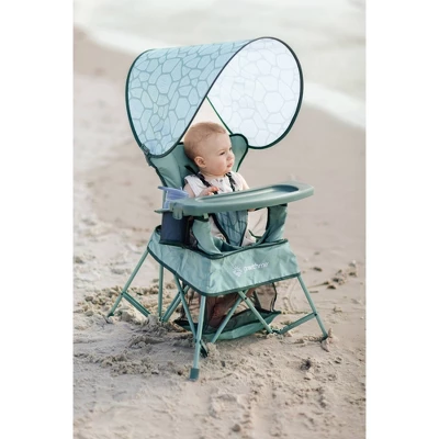 Travel with ease using the Go With Me® Venture Chair. The 5-point removable harness makes your stable baby secure and comfortable as they sit upright in the seat. As baby grows, the seat can un-velcro to reveal two leg holes perfect for letting the baby stand with support. The chair can then be used through toddler and big-kid ages, either with or without the snack tray. Indoor/outdoor polyester along with the included sun canopy makes this the perfect chair to carry with you for use outdoors, or anywhere indoors.
