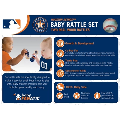 This set of two rattles of the Boston Red Sox is designed to make it easy for small baby hands to play with. Baby-friendly products help your little Red Sox fan grow healthy and happy. Growth & Development toys offer Co-Play Fun, Tactile Play, and Sensorimotor Skills. Show baby how to shake the rattles to make noise. Your smile encourages baby to keep playing as you teach them new skills. Help baby develop grasping and fine motor skills. Knobs, handles, and rings offer various shapes for baby to explore. Baby discovers cause-and-effect of movement making sound. Rings shake against each other to create rattle sounds. Real wood rattles are 100% Baby Safe made with real wood, non-toxic colors & finishes, and free of BPA, phthalates, & formaldehyde.