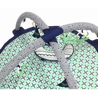Encourage childs early visual development with bold patterns and bright pops of color! Bacati baby gym features bold colors to stimulate babys sight as he or she grows with familiar view of the cordinating bedding Sets and Nursery Decor to view and make her calm and comfortable. This baby gym even has fun feeling as baby looks at the four hanging soft toys. Bacati Baby Activity Gym : 3 ways to use it : Tummy time, Without Arches or With Arches. Bacati activity gym includes six friendly toys to help baby discover textures & patterns. Bright colors to keep the baby busy. 13 loops to attach toys high, low or on the mat. Baby can look and feel all four brightly colored toys while laying on the so?t, quilted mat. Includes a tummy time pillow for muscle development. Multiple developmental activities, Kids inspired graphics and hanging toys, 10 loops to hang their favorite toys and favorite places to low or high or on the mat. Quick two-minute assembly. Includes supportive Tummy Time Pillow for muscle development. Mat is machine washable made with 100 percent cotton percale fabrics with polyester filling. Product Features: – Ages 0+ – Three ways to play: overhead play, tummy time, playmat – Multiple developmental activities – Bold, high contrast Four hanging toys, – Colorful mat with toy loops for tummy time – Crescent Moon shaped tummy time pillow – Size (inches): 36l x 36w x 20h; (cm): 91l x 91w x 51h Product Instructions: 1. Place mat flat on floor with pattern facing up, and place arches on top. 2. Select any white clip (at ends of each arch) and insert it into the nearest corner slot on the mat. 3. Reach under mat and attach to the matching white clip on the bottom of the mat. 4. Repeat on opposite corner of the mat to complete one arch, then twist arches into an X and repeat with second arch. Additional Warnings: – Requires assembly by an adult. – Activity Mat and Tummy Time pillow should not be placed in crib or playpen. – Use this product only on the floor. – Never leave baby unattended on mat. – Only for domestic use.