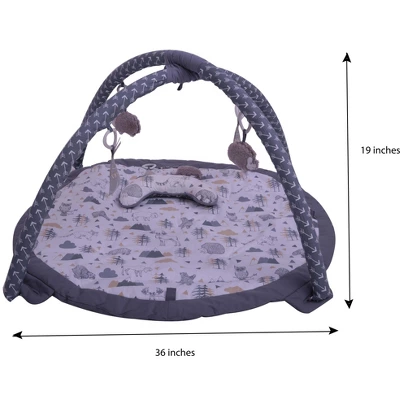 - Bacati Baby Activity Gym includes play mat, arches with 4 toys and crescent moon shaped pillow packaged in a polyzipper bag