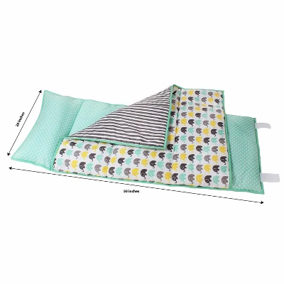 The Bacati Toddler Nap Mat is our cutest nap mat yet and customer favorite! With an attached comforter blanket and a convenient removable pillow, you can be sure your little one will stary warm and cozy. The mats are made for children of all ages and sizes measuring in at 20 x 50 inches. It rolls up with a snap closure and has a carrying handle for added convenience. Perfect for nap time at preschool, daycare or even sleepovers at grandmas house. Its large size makes it versatile as a playmat as well as a nap mat. The toddler nap mat is machine washable and gets softer with every wash. The shell is made 100% cotton percale fabrics that are hypoallergenic, breathable and perfect for childrens sensitive skin. The attached blanket is also 100% cotton percale with polyester batting. It has a layer of polyester batting inside the bottom of the mat, to provide added comfort and support. Also included is 100% polyester filled removable pillow.