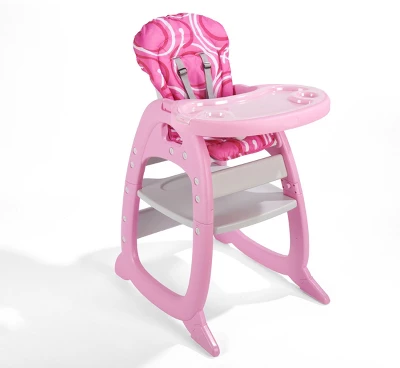 - Converts back and forth from a full-size highchair to a separate play table and chair.