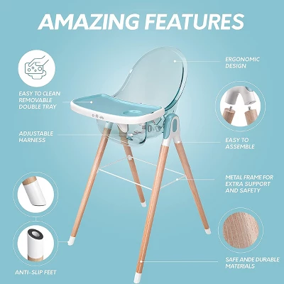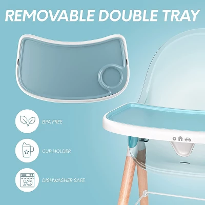 - Full of amazing features, this high chair features a removable double tray, a metal frame for additional stability, an adjustable harness and anti-slip feet.