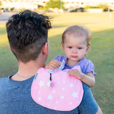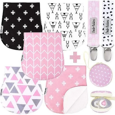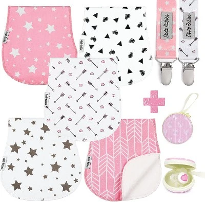 This Dodo Babies unisex gift set includes a 5-pack of burp cloths in 5 different sweet patterns. These soft cloths are the ideal size and shape for tossing over your shoulder to catch your babys spit-up or drool. Each set of 5 cloths comes with a handy pacifier case and 2 pacifier clips (for attaching your babys pacifier to their clothing), in coordinated patterns and colors. Pacifier not included.