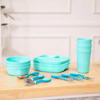 - 15-piece kid-sized divided plates, bowls, cups and utensils