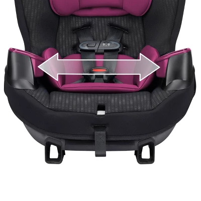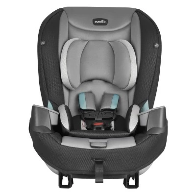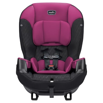 With the Sonus 65 Convertible Car Seat from Evenflo, you can keep your child in a rear-facing car seat up to 2 years or 40 pounds, and then quickly and easily convert to a front-facing toddler car seat. This two-in-one car seat is designed with a compact base that can fit in any of the three back seats in most compact cars, but it still provides comfy features for your child with a wide enough seat, ventilated back for airflow, harness covers, and removable head and body pillows for extra support. There are six different harness strap positions to ensure a perfect fit as the convertible car seat grows with your child, and machine washable pads plus removable cup holders help make cleaning and care easier so you can keep it in good condition over years of use. Each Sonus 65 Convertible Car Seat is structurally tested for safety in the event of a rollover accident, and meets or exceeds all applicable federal safety standards for side impact testing.