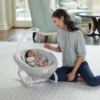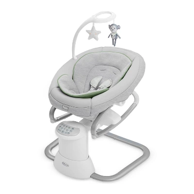 The Graco® Soothe My Way™ Baby Swing with Removable Rocker features 8 soothing motions in 2 directions, for 16 ways to soothe baby. The 2-in-1 design offers a swing seat that doubles as a removable rocker for use throughout the home. Plush fabrics and a removable body support provide added comfort for your little one. The multi-directional seat allows baby to swing facing front, right, or left, for the most soothing options. A 5-point harness keeps baby secure. 6 swinging speeds allow parent to adjust for baby’s happiness and the 3-position recline makes for baby’s optimal comfort. Choose from 15 songs and sounds—10 melodies and 5 nature sounds—to calm and comfort baby. Plus, 2 vibration speeds help to soothe your little one. The adjustable toybar features 2 soft toys to keep baby entertained. Includes an AC adapter.