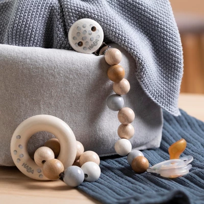 Here comes a double delight! This robust twin clutching toy trains baby’s fine motor skills in a playful way. The ingenious wooden beads also adorn the matching pacifier chain. A constant source of wonder for baby to explore. Cleaning Instructions: HABA recommends using a cloth lightly dampened with warm water. If you wish to disinfect the toy with a cleaning agent, use a small amount of either water and a mild dish soap or a water & vinegar essence mix. Both options work extremely well in destroying bacteria and cleaning wooden toys. After cleaning, wipe the toy dry with a clean cloth. Remember, Wood is a natural material that soaks in moisture. Do not ever submerse wooden toys in water or place in a dishwasher. Disinfectants (even organic baby wipes), should not be used as they can damage the water based protective coatings applied to protect the stains or paints beneath.