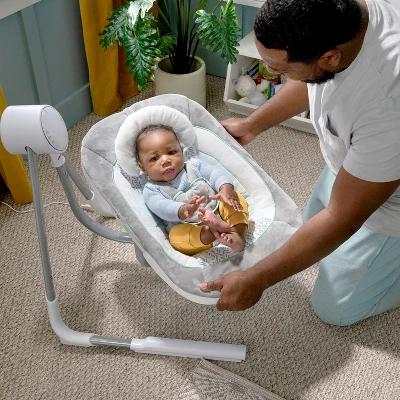 The Ingenuity AnyWay Sway Portable Swing gives your little one a cozy place to sit, snuggle, and sway. This fully-loaded baby swing rotates 180° and swings in 3 directions, helping baby stay soothed while in sight. Pick between 2 modes with soothing vibrations: calming swing or stationary seat with 2 reclining positions. A pivoting toy bar with bunny plush toy helps capture baby’s attention. A removable headrest supports newborns, and the quiet swing motor helps baby stay undisturbed. The GentleTouch control pad allows you to play 19 different melodies including nature sounds and white noise at your choice of volume without pressing buttons. Music automatically shuts off after 20 minutes. Choose between a 30, 45, or 60-minute swing timer with auto shut-off at 2 hours. Plug in the unisex AnyWay Sway using the battery-saving electric USB cord (wall adapter NOT included). A compact, foldable design makes the swing easy to store and transport. Use from birth to 9 months or up to 20 pounds.