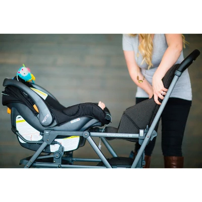 - Adds an infant seat to front or back of stroller