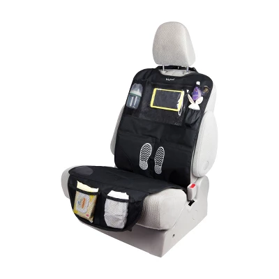 The Lulyboo Auto Seat Protector is designed to protect your car’s upholstery from wear and tear caused by baby carriers, car seats, and messy spills. The durable, easy-to-clean seat protector features an extra large smart device window to keep baby entertained on the go. With three large mesh side pockets and easy to reach front storage space, parents can keep toys, devices and baby supplies organized and accessible. Adjustable strap makes it easy to install and secure the seat protector to your vehicle’s headrest. The non-slip grip material helps to prevent the car seat or baby carrier from shifting. For use with both front and rear facing car seats.
