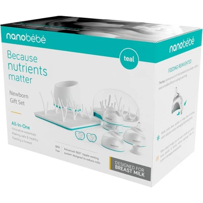 Nanobebe’s Newborn Gift Set provides an all-in-one solution with everything a new parent needs for a smarter feeding routine focused on health, convenience, and style. This set features 4 Nanobebe Breast milk Bottles, which are the first and only specifically designed to protect nutrients within due to the breast-like shape. The design also prevents nipple confusion for smooth transitions between breast and bottle, so loved ones can share and experience the special bond of feeding time. These bottles are huge space savers– they stack! Mom can pump, store, warm, and feed all from the same bottle. The set also includes a slim drying rack that stores at only a half inch with removable and adjustable pegs to fit all bottles, sippy cups, and breast pump accessories. The sterilizer removes 99.9% of household bacteria in under 4 minutes, so parents can rest assured that all their baby’s bottles, teethers, pacys, and pumping gear are clean and sterile. Also included: a sleek, eco-friendly bottle warmer, pump adapters, storage caps, nipples, and 2 baby loved flexy pacifiers. Nanobébé’s Newborn Gift Set is topping baby registries and is a must-have for modern parents, their family and above all… baby.