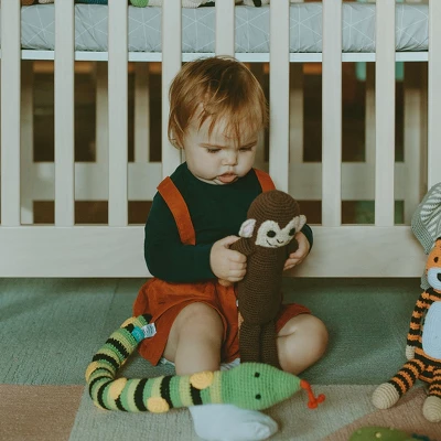 Monkey came swinging in from the jungle, full of mischief and causing lots of giggles! Handmade with buttery soft brown yarn, he is just the right size for little hands to grab and hold. Perfect for hours of imaginative play.