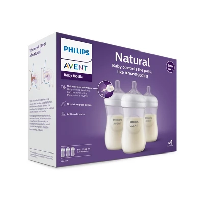 Philips Avent Natural bottle with the Natural Response nipple lets baby control the pace of the milk, like they do when breastfeeding. The nipples’ unique opening and tip only releases milk when your baby actively drinks. When pausing to swallow and breathe no milk flows. Baby can drink, swallow, and breathe using their natural rhythm, just like they do when breastfeeding. Easily combine breast and bottle feeding with a wide breast-shaped nipple with a soft feel that mimics the shape and feel of a breast; plus baby controlling the flow of milk like they do when breastfeeding. The nipple has a no-drip design which helps prevent lost milk from the tip. An anti-colic valve integrated into the nipple is designed to reduce colic and discomfort by sending air away from your baby’s tummy. The ergonomic shape makes it comfortable for parents to hold and easy for small fingers to grasp. Assembly is simple with only a few parts and the wide bottle neck makes filling and cleaning easy. The Natural bottle is made from polypropylene, a BPA free material, and works with all nipples and caps from the Natural line. The Natural response nipples come in flow rates 1-5, to keep up with your baby’s growth. Includes: 3 9oz Natural bottles with Natural Response nipples, flow 3. SCY903/93