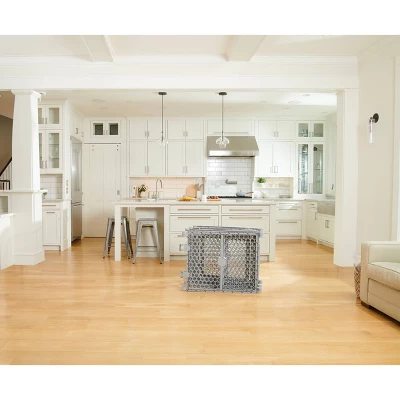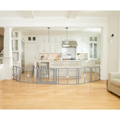 Made of high-quality plastic, the 6-panel gate expands up to 192” wide and is designed with plastic hinged posts to offer a variety of shaping possibilities. It is ideal for large and angled openings or as a play yard for your child.