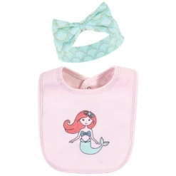 Hudson Baby Infant Girl Cotton Bib And Headband Or Caps Set, Coral Mint Mermaid, One Size