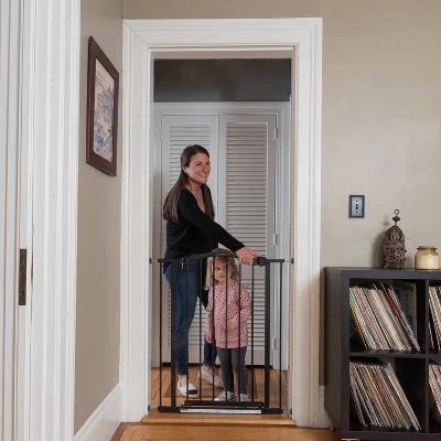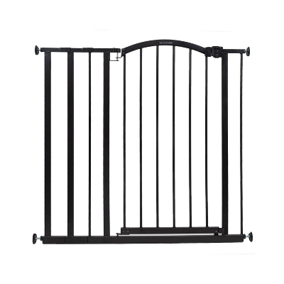 With its stylish arch, the Summer® Extra Tall Décor Safety Gate is secure, convenient, and compliments your home’s look. This 36” tall baby and dog gate fits openings 28.75” to 39.75” wide and can be installed in doorways or hallways using the no-drill pressure mount system with adhesive wall cups. Hardware is included for a secure installation at the top of stairs. It’s easy to operate this gate with one hand. The door stopper helps prevent the door from swinging outward over stairs. Package includes hardware installation kit. Recommended tools for hardware installation: drill, Phillips-head screwdriver, pencil, measuring tape.