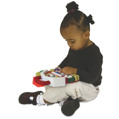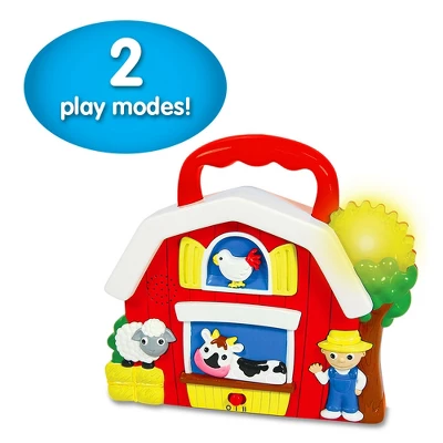 Babies and toddlers will welcome Old MacDonaldâs Farm with open arms once they see and hear the delightful sounds and lights coming from the lightweight portable barn shaped toy with friendly faces. Little ones can select either mode â animal sounds like âmooâ and âbaaâ and Old MacDonaldâs Farm to sing along with. Large whimsical buttons, a bright red barn background, and a cheerful tree and sun that lights up make this a joyful classic! It has a large rounded handle for easy carrying, too. Measures 9â long x 7.5â high. Ages 12+ months. Requires two AA batteries (included).