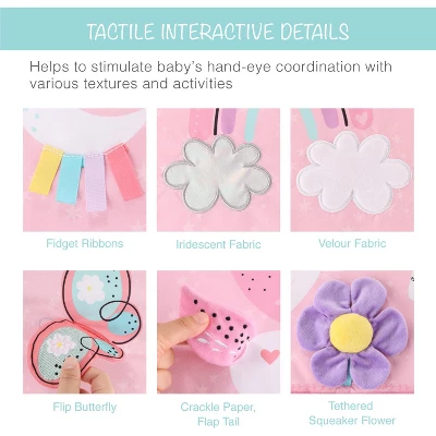 - Helps to stimulate baby’s hand-eye coordination with various textures and activities