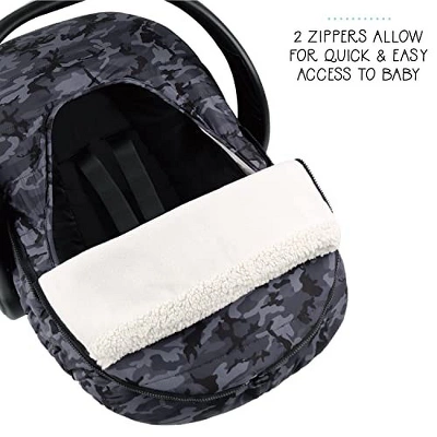 Keep your little one warm and cozy with The Peanutshell Black Camo Seasonal Car Seat Cover. Featuring a print of grey and black camo design and a soft fleece interior, this seat cover is stylish and modern; the elasticized outer band makes it easy to stretch and use, fitting over infant carriers, and securely attaching to car seats. A removable top provides temperature control, making this ideal for keeping baby comfortable. This baby carrier cover provides warmth and comfort and is a protector from cold weather. Our car seat covers for infant car seats make essential travel accessories for your newborn boys or girls.