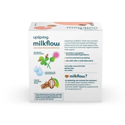 UpSpring MilkFlow Drink Mix Breastfeeding Supplement Packets contain a proprietary blend of milk-optimizing herbs that have been traditionally used across cultures and over centuries to support breast milk supply. The naturally-sourced herbs include fenugreek, blessed thistle, and anise. Plus, these chocolate-flavored drink packets contain electrolytes to help restore and replenish your body.* Safe to use when pumping, this breastfeeding drink mix works naturally with your body to support the hormones that help support your breast milk supply.* Women who are breastfeeding should increase fluid intake by about 30%, so a lactation supplement drink mix is a great way to support your milk supply and make every sip count.