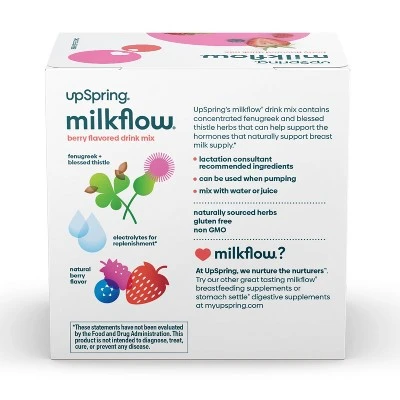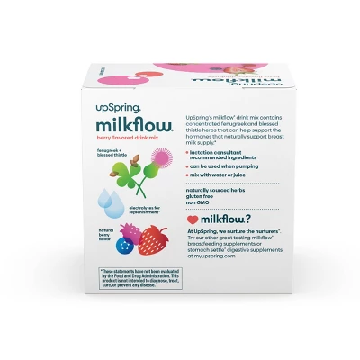 UpSpring MilkFlow Drink Mix Breastfeeding Supplement Packets contain a proprietary blend of milk-optimizing herbs that have been traditionally used across cultures and over centuries to support breast milk supply. The naturally-sourced herbs include fenugreek, blessed thistle, and anise. Plus, these berry-flavored drink packets contain electrolytes to help restore and replenish your body.* Safe to use when pumping, this breastfeeding drink mix works naturally with your body to support the hormones that help support your breast milk supply.* Women who are breastfeeding should increase fluid intake by about 30%, so a lactation supplement drink mix is a great way to support your milk supply and make every sip count.